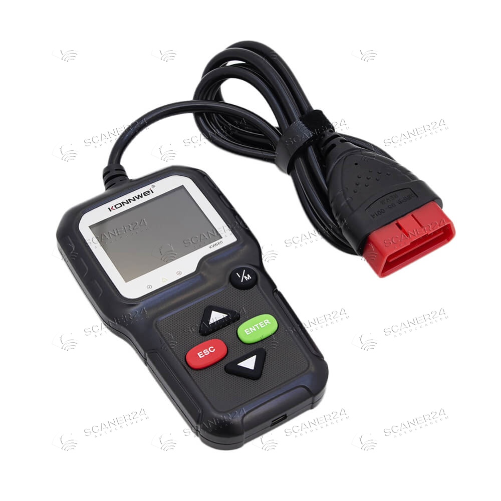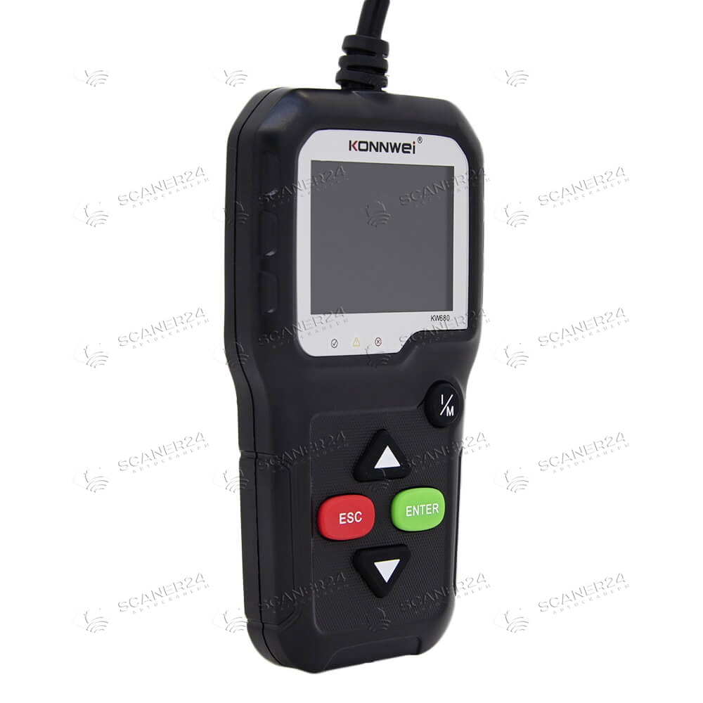 Автосканер Konnwei KW680 – устройство, предназначенное для программирования блока управления автомобиля, поиска и устранения неисправностей в его бортовой сети. Поддерживает протоколы CAN, ISO 14230, ISO 9141, J 1850 PWM, J 1850 VPW, подойдет для работы с марками европейского, американского, японского производства. Сканер оснащен цветным экраном, на который выводятся полученные данные. Выполнен в черном пластиковом корпусе, на передней панели имеются четыре кнопки управления. Прибор достаточно компактный, хорошо лежит в руке при эксплуатации. Оснащен интуитивно понятным интерфейсом, есть меню на русском языке.